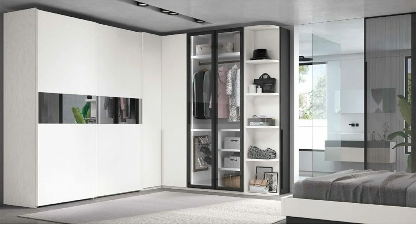 Armario rinconero en color blanco polar con acabados en color pizarra lacado.