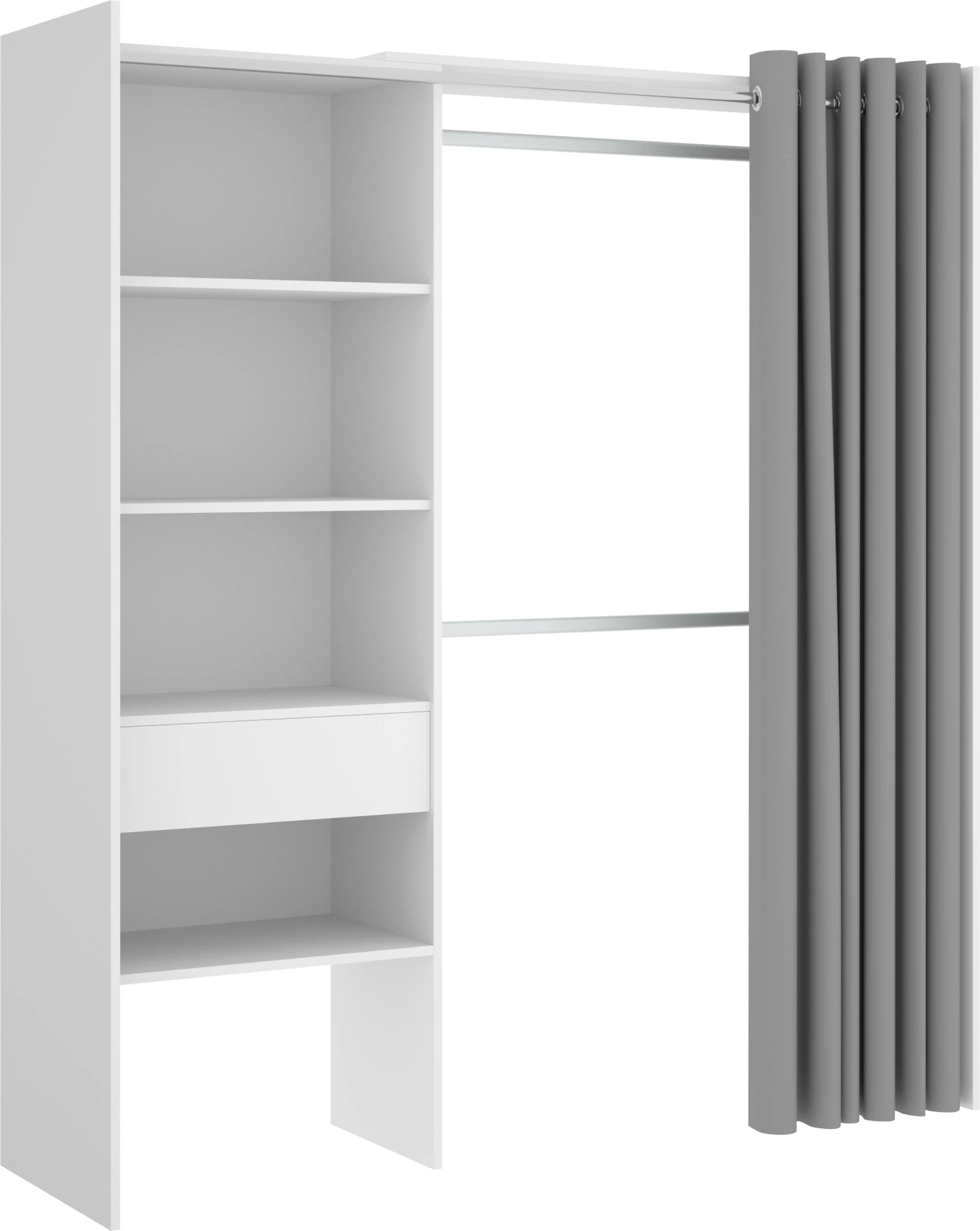 Vestidor alto muy funcional con cortina adaptable en medida cortando las barras para colgar. Incluye 4 estantes y 2 barras.