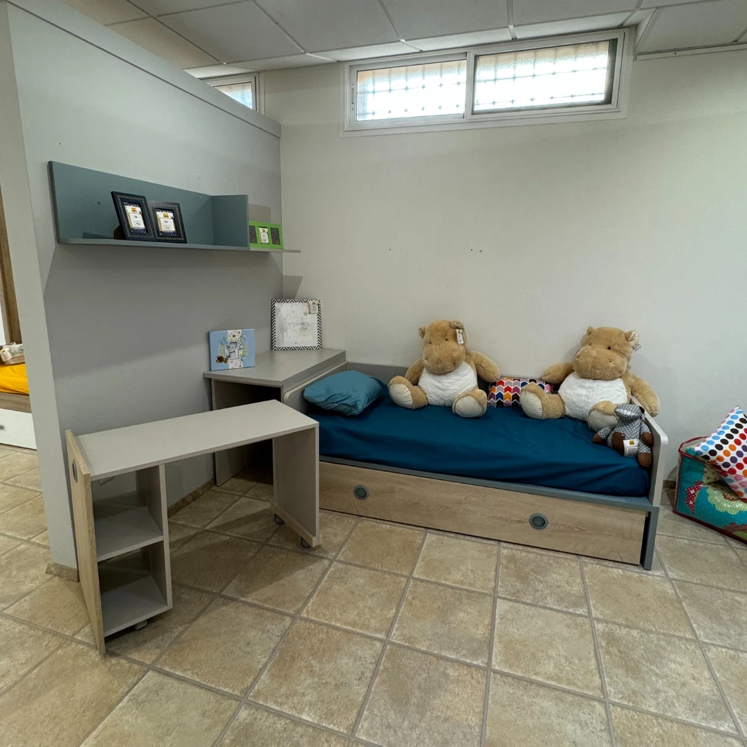 Cama nido con arcón convertible en escritorio para dormitorio juvenil color roble. Incluye también estante de pared.