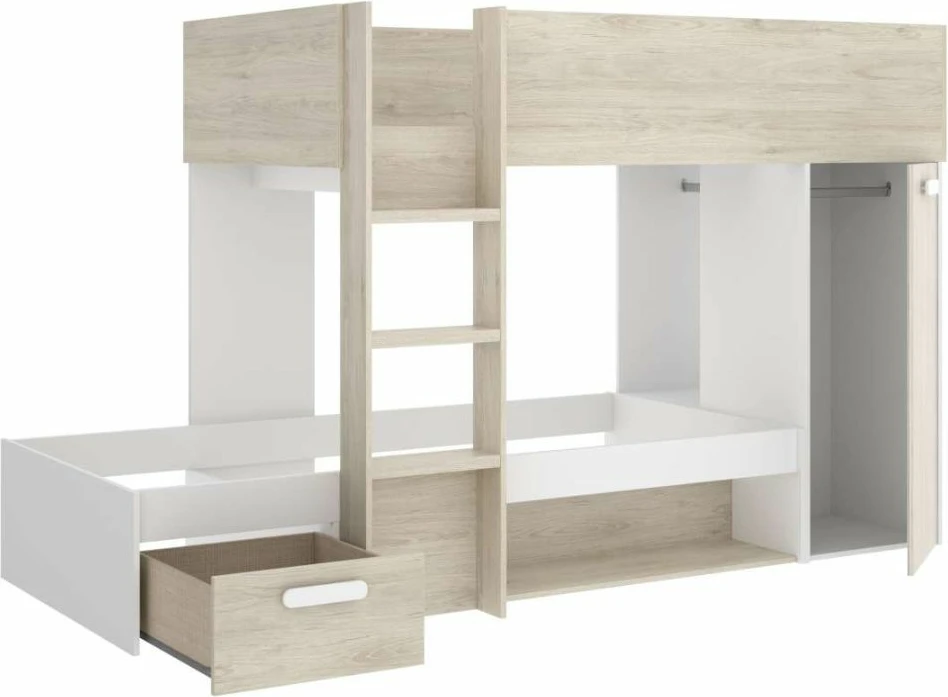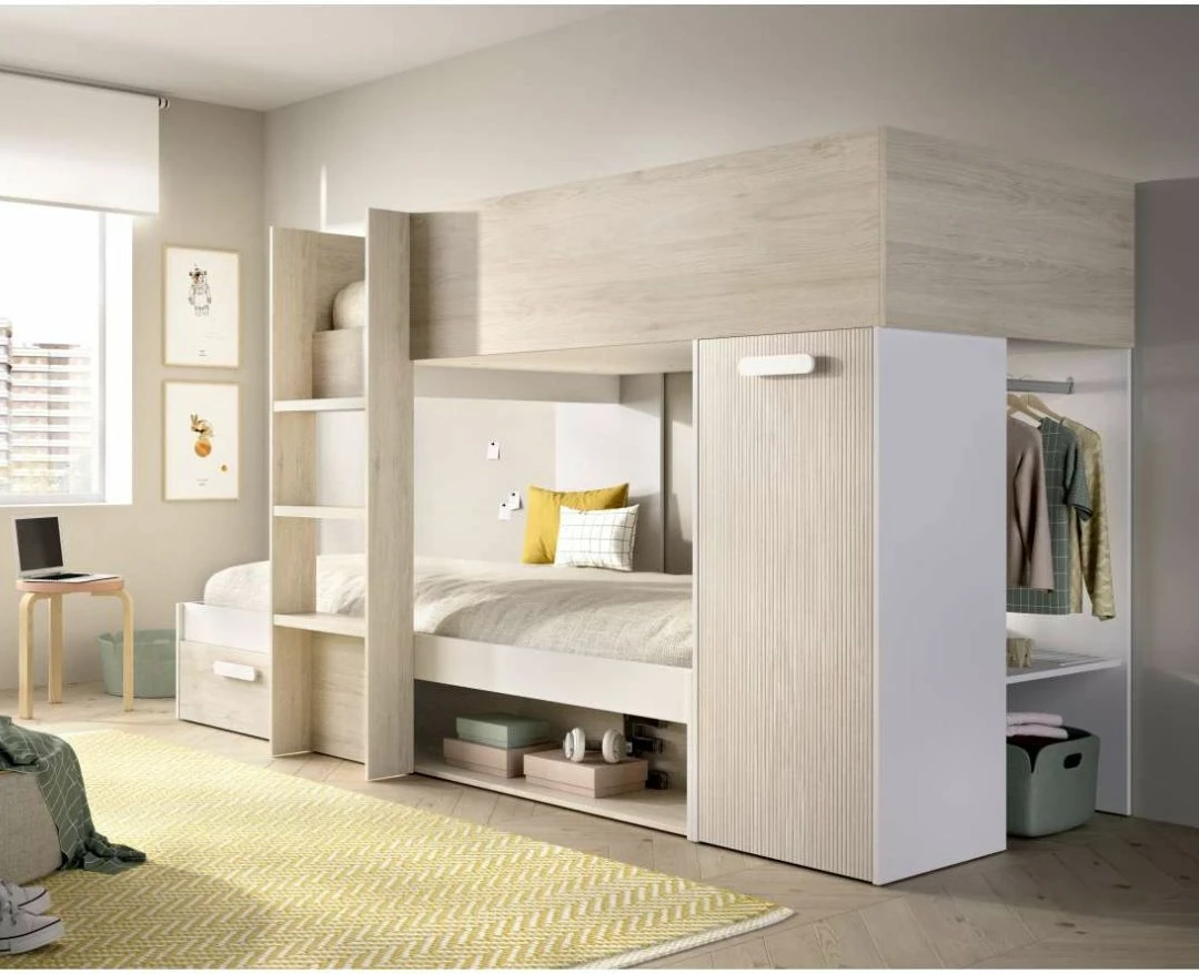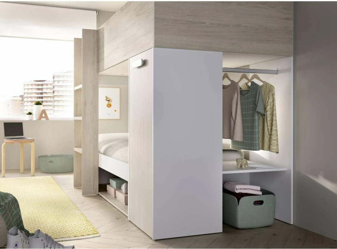Cama tren de 2,45 m con 2 camas con espacio de almacenamiento. Además un armario con barra y estante, un espacio abierto tambien con barra, un práctico cajon en la parte inferior y un hueco grande al otro lado, proporcionando un amplio espacio de almacenamiento para la ropa y los juguetes.