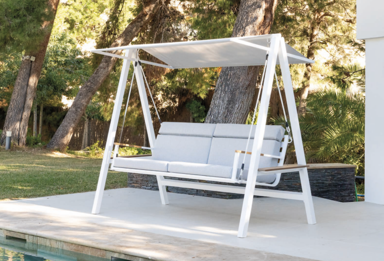 Columpio Artola de exterior fabricado en aluminio, madera en color blanco y gris cojinería de olefina color gris