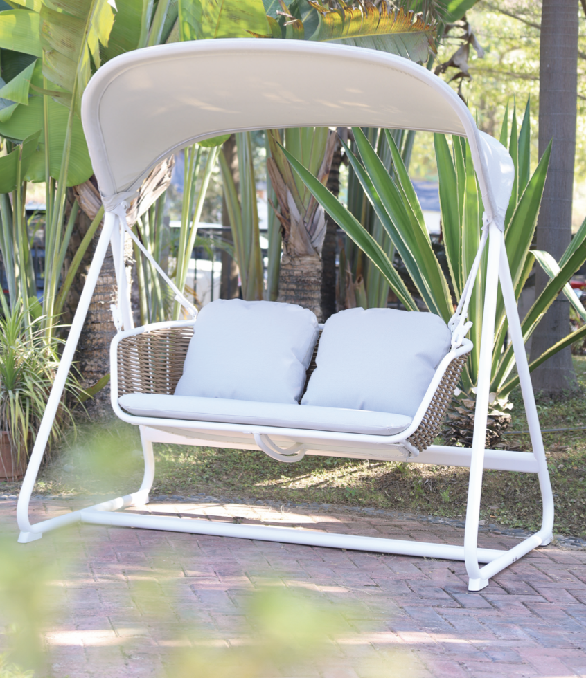 Columpio Coral de exterior fabricado en aluminio, fibra en color natural columpio trenzado con fibra color natural