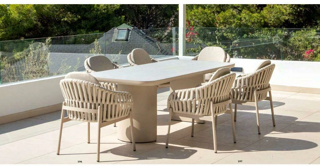 Dale un toque elegante y natural a tu comedor exterior con el conjunto Cairo. Este comedor incluye una mesa de 218 cm en aluminio (color topo o antracita) con tablero HPL resistente, y seis sillones con respaldo trenzado a mano en cuerda. Incluye cojines beige.