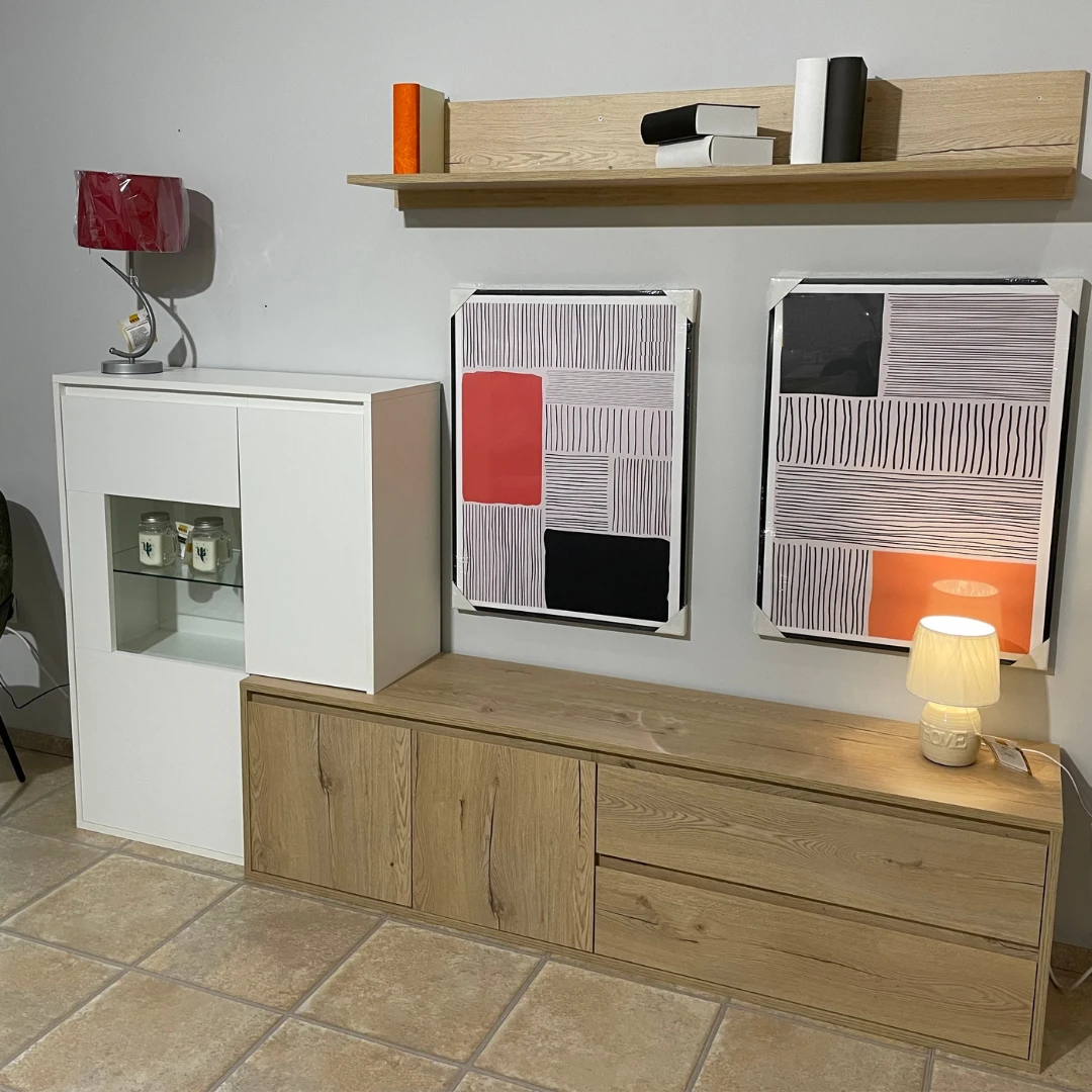 Composición de salón 235 cm que combina vitrina blanca con mueble de TV y estante roble.