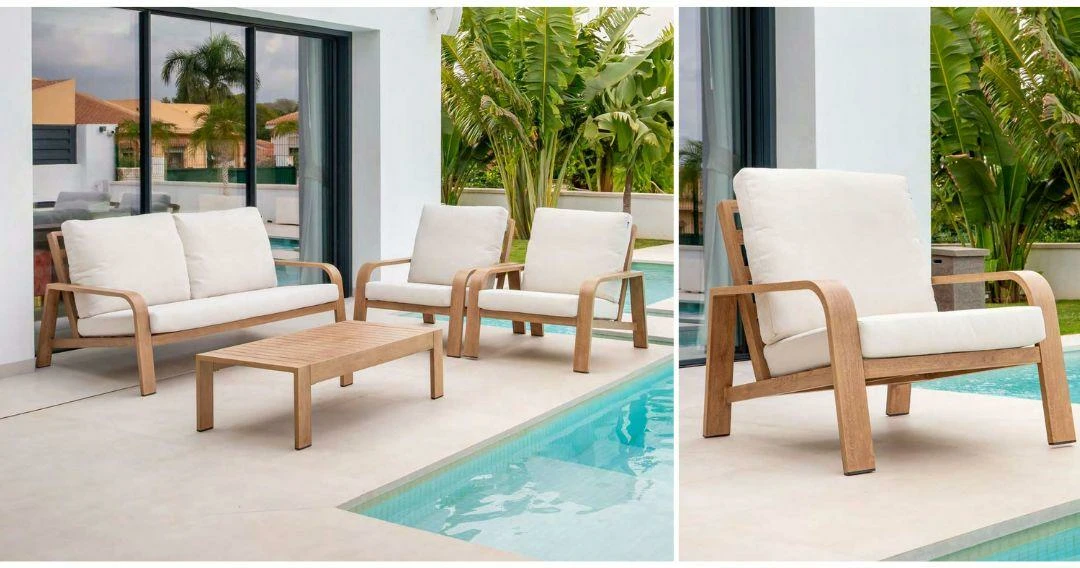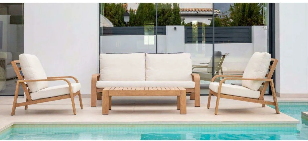 Conjunto de exterior con estructura de aluminio con acabado imitación madera. Cojinería en olefina de 12 cm de grosor en color beige, ideal para exteriores. La mesa incluye un tablero con lamas de aluminio.