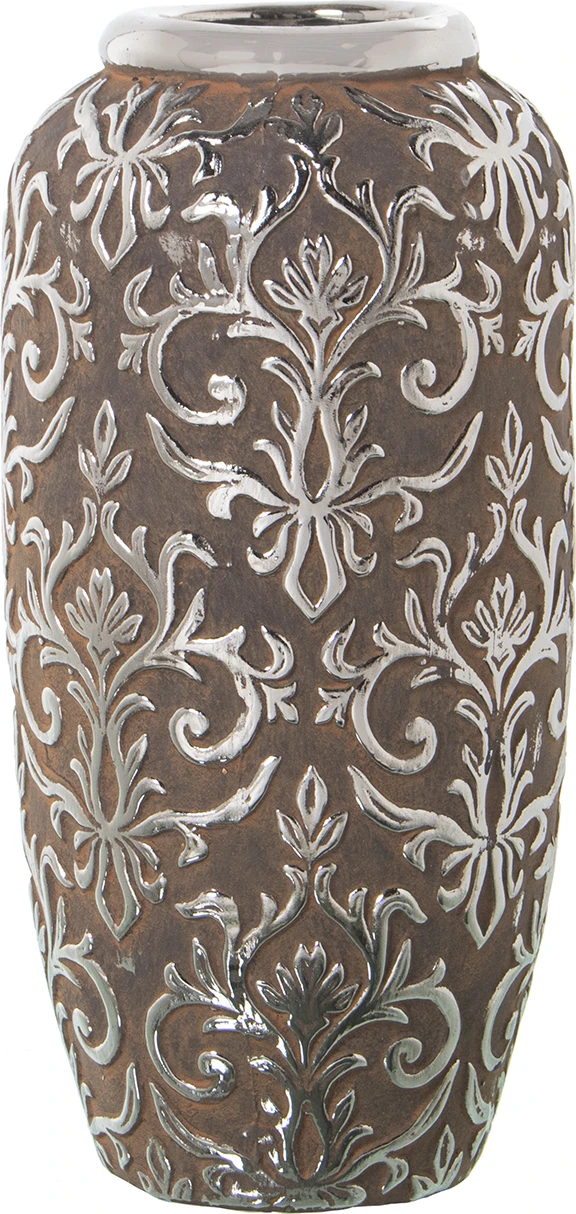 Jarrón cerámica marrón detalles plata ø14X28 cm