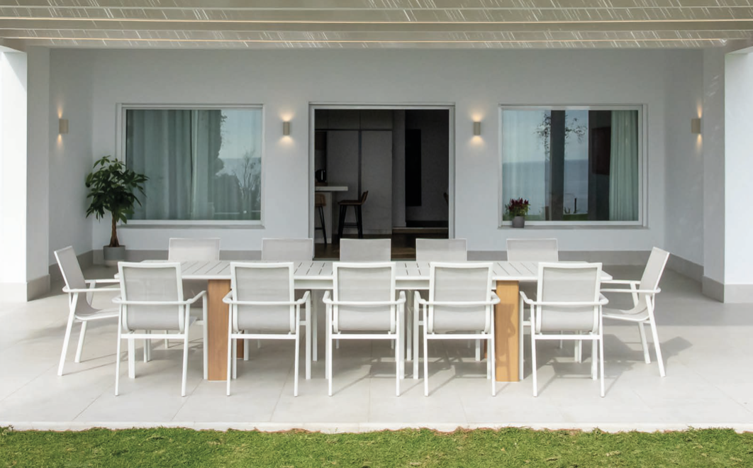 Mesa Arias de la colección exterior Majestic Garden. Fabricado en aluminio, madera, textilene. con acabados en color crema. Asiento de textilene en color crema. Tablero extensible color crema. Medidas: 233/350x100x76 cm.