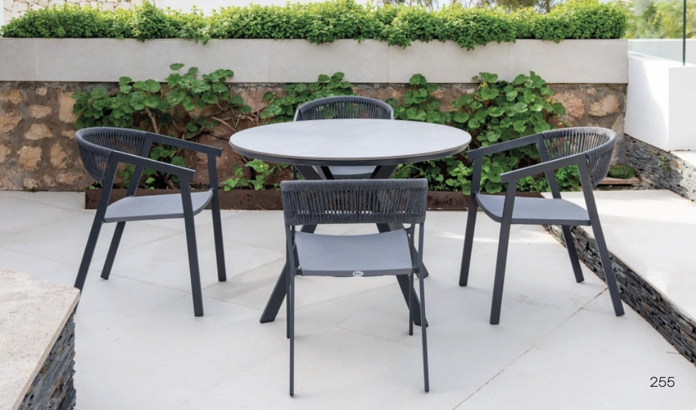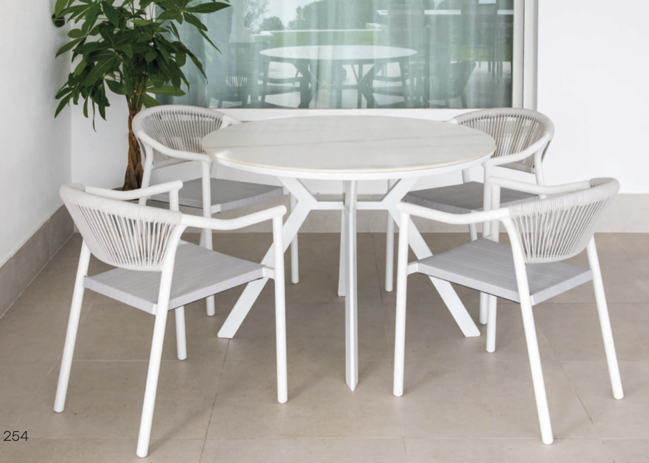Mesa Chile de la colección exterior Majestic Garden. Fabricado en aluminio, cuerda, textilene. con acabados en color blanco y antracita y gris. Asiento de textilene color gris. Respaldo trenzado con cuerda color gris. Respaldo trenzado con cuerda de color antracita. Tablero cerámico imitación mármol blanco o piedra gris. Medidas: Ø110×75 cm.
