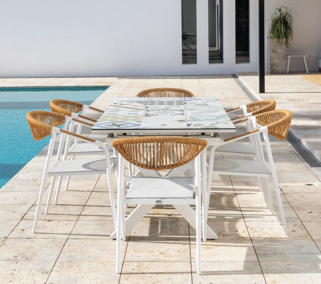 Mesa Mosaica de la colección exterior Majestic Garden. Fabricado en aluminio, cristal. con acabados en color blanco. Tablero extensible automático de cristal impreso. Medidas: 180/240x90x77 cm.