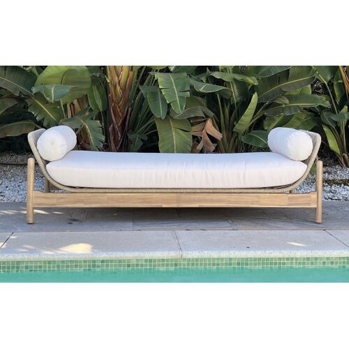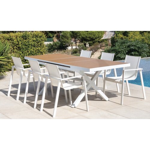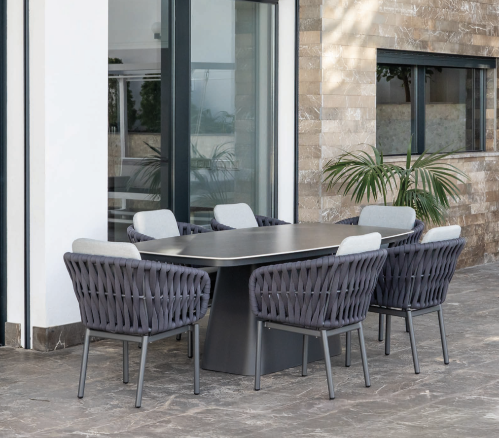 Mesa Quilmes de la colección exterior Majestic Garden. Fabricado en aluminio, madera, olefina. con acabados en color blanco y antracita y gris. Asiento trenzado en cuerda en color gris. Cojinería de Olefina en color gris. Tablero cerámico imitación madera. Tablero cerámico imitación mármol antracita. Medidas: 220x100x80 cm.