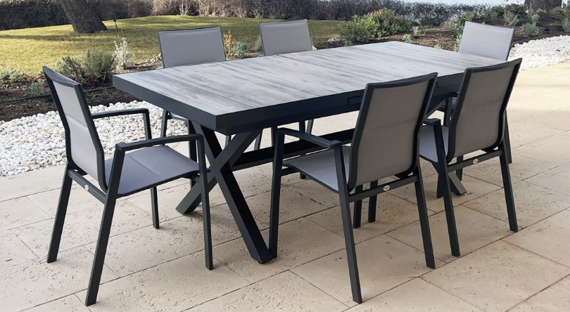 Mesa Segovia de la colección exterior Majestic Garden. Fabricado en aluminio, madera, textilene. con acabados en color blanco y antracita y gris. Asiento de textilene acolchado color blanco o gris. Asiento de textilene color antracita. Tablero extensible automático de cerámico imitación madera gris. Medidas: 160/200x100x75 cm.