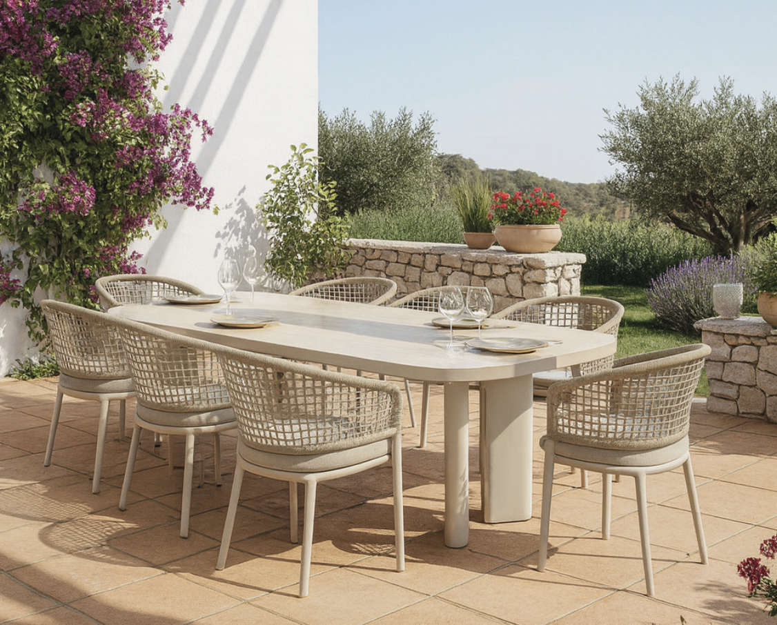 Mesa Serena de la colección exterior Majestic Garden. Fabricado en olefina, cuerda. con acabados en color crema. Respaldo trenzado con cuerda de Olefina color crema. Cojinería de Olefina en color crema. Medidas: 240x110x74 cm.