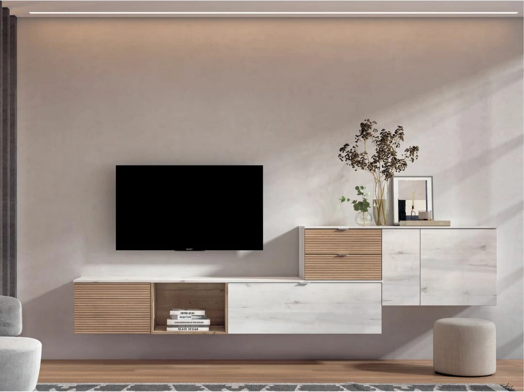 Mueble modular de salón colgado con frentes rayados. Acabado en color Albo-Naturale combinado con tiradores uñero blancos para un diseño limpio y contemporáneo.