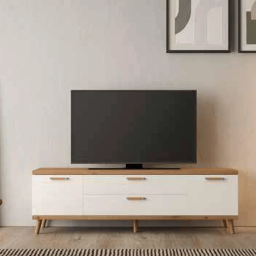 Mueble bajo de TV con dos puertas y dos cajones color Polar con base y tapa color Artisan. Juego de cinco patas redonda Artisan.
