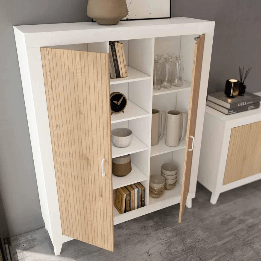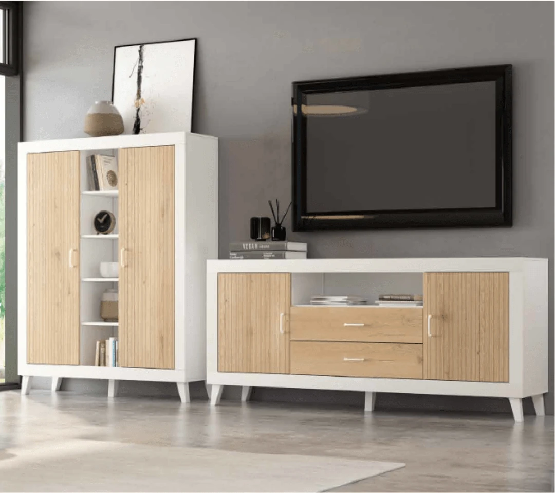 Composición de salón soul blanco/lined roble/ roble con patas inclinadas compuesto por: Módulo de 2 puertas y 5 huecos de 120 cm, bajo de 2 puertas, 2 cajones y un hueco de 180 cm.