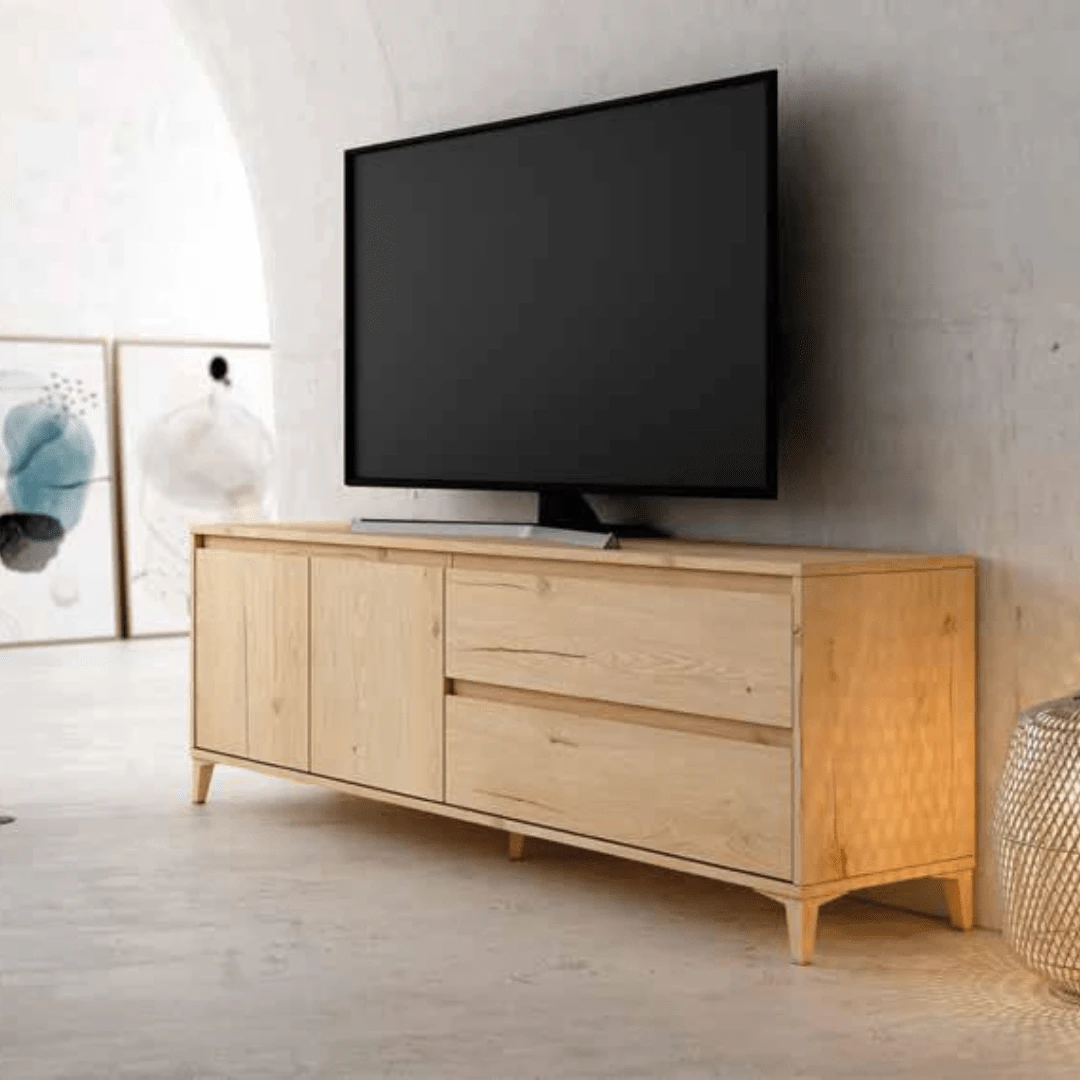 Mueble de TV con 2 puertas y 2 cajones de 178 cm ancho color roble y patas piramidales.
