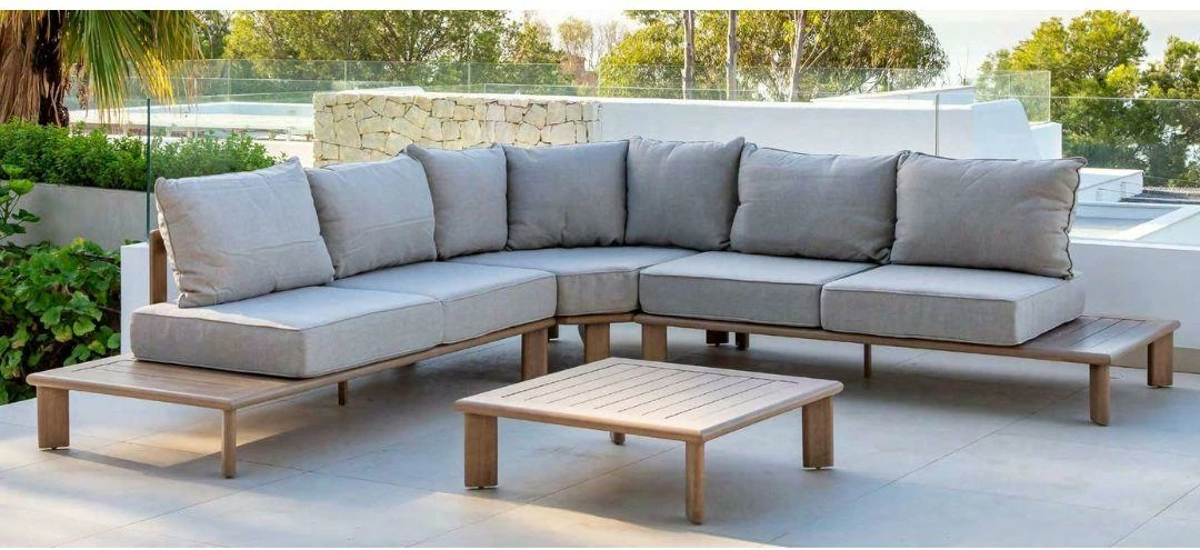 Rinconera de jardín y mesa de centro en aluminio imitación madera
