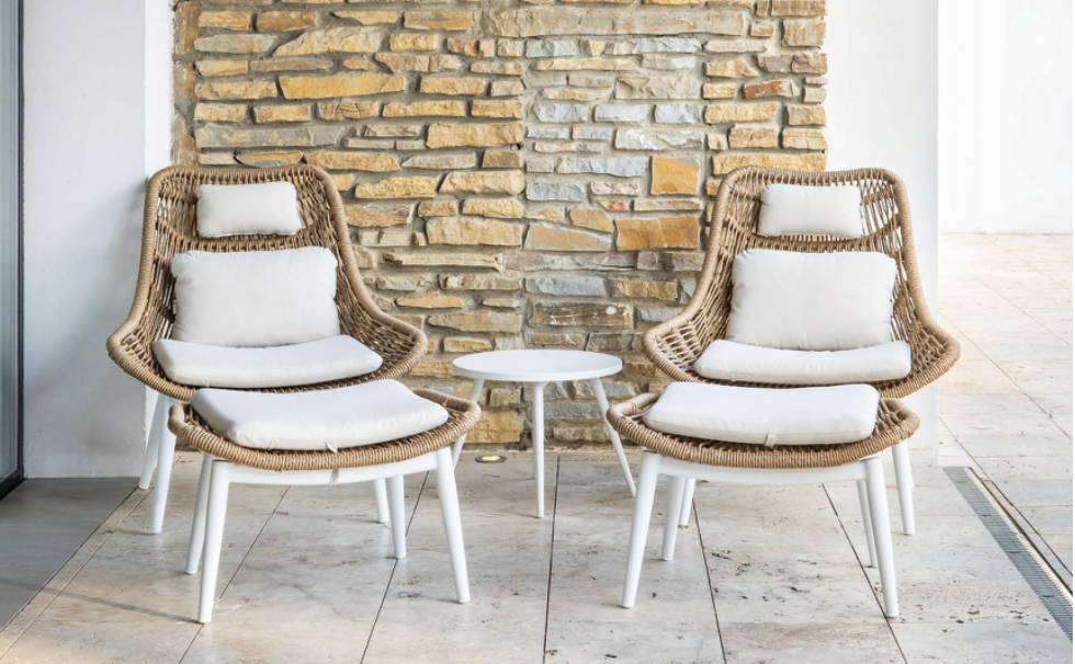 Set relax Victorica para exterior con reposapiés victorica | mesa chic diseñada en aluminio blanco | mesa chic fabricado en cuerda en color natural asiento trenzado de cuerda sintética color natural