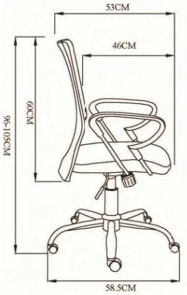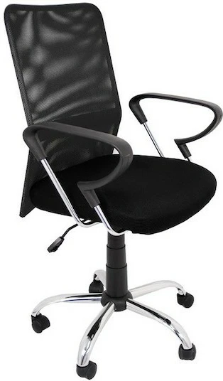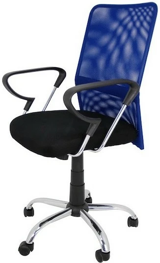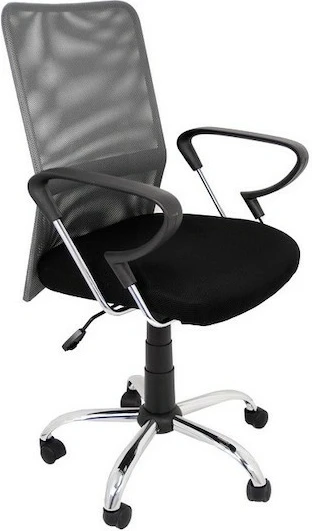 Silla de escritorio infantil/juvenil con asiento textil, respaldo en rejilla transpirable y base cromada.