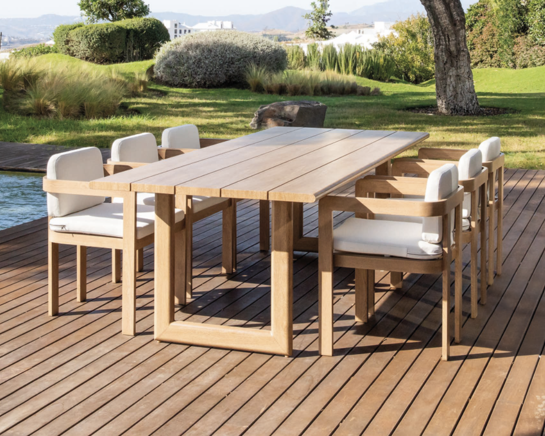 Sillón Córcega de exterior fabricado en aluminio, madera en color beige cojinería de olefina color beige