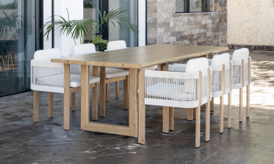 Sillón Pinamar de la colección exterior Majestic Garden. Fabricado en aluminio, madera, olefina. con acabados en color beige. Cojinería de Olefina color beige. Asiento trenzado en cuerda de textilene color beige. Tablero de aluminio imitación madera. *Disponible sofá, taburetes y tumbona. Medidas: 56x54x68 cm.