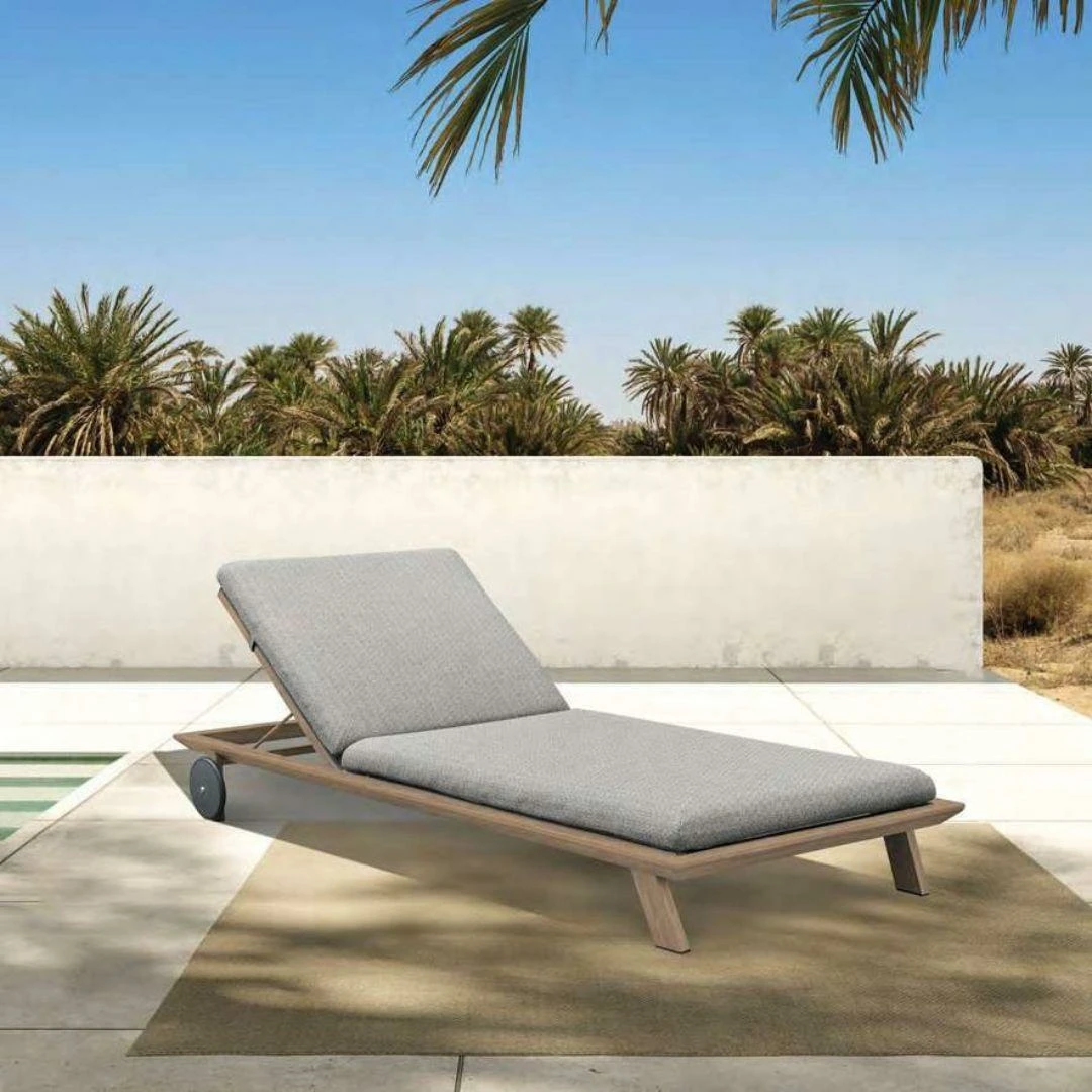 Descubre la tumbona de jardín Angola fabricada en aluminio imitación madera. Con ruedas traseras y cojinería desenfundable con olefina.