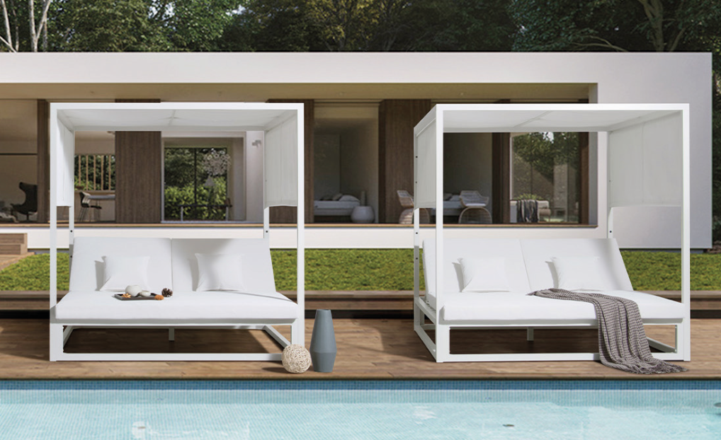 Tumbona doble California de aluminio color blanco. Cojinería de batyline color blanco. Cortinas laterales color blanco. Respaldos reclinables.
