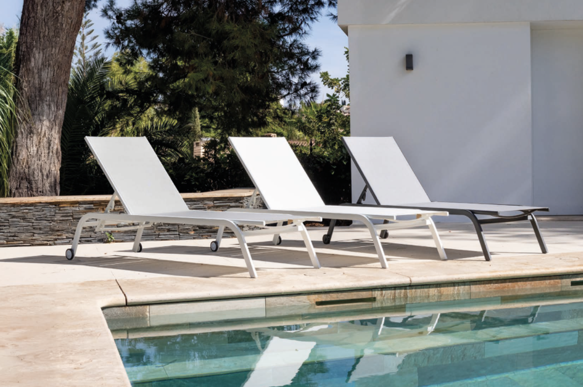 Tumbona Marbella de exterior fabricado en aluminio en color blanco ruedas traseras