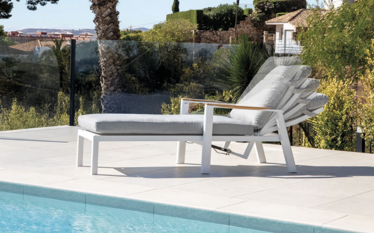 Tumbona Tambo de exterior fabricado en aluminio, madera en color blanco y gris cojinería de olefina en color gris